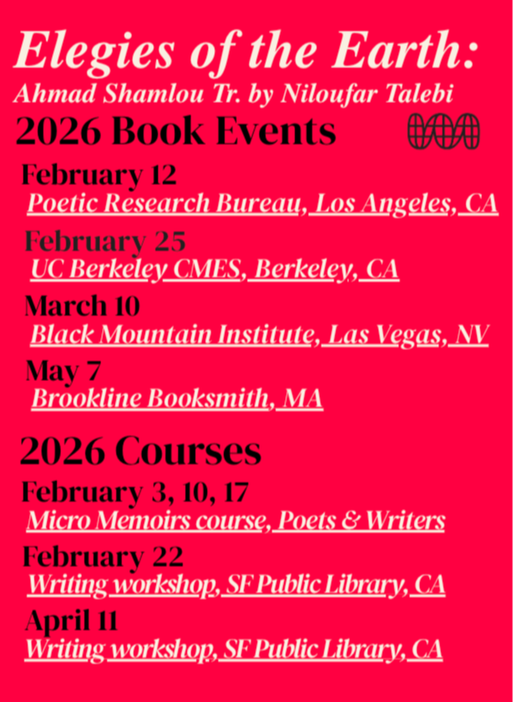Niloufar Talebi is a master instructor and multidisciplinary artist. I am filled with new guidance, and inspiration. She is professional, punctual, warm, and thoughtful. Her feedback is constructive and leaves you ready to take the next step. She is exceptionally talented at elevating writers.