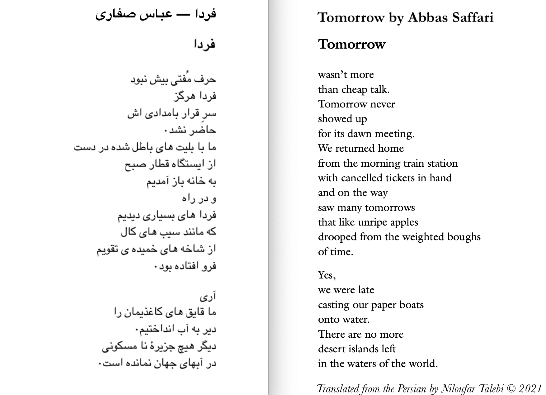 Mr. Saffari's poetry was a reflection of his essence as a human being — accessible, honest, noble, tender, fresh, full of integrity. He was widely published, read, and beloved in Iran. I not only had the pleasure of translating and performing his poems, but of also inviting him to read at the Iranian Literary Arts Festival 2009 that I organized through my nonprofit at the time, The Translation Project, in partnership with the San Francisco International Poetry Festival and the Friends of the San Francisco Public Library. I also facilitated more exposure of his work through connecting him with Words Without Borders, PEN Dallas, and Rattapallax. My films of his poems screened at international poetry-film festivals. Here is a two-part interview he did (in Persian) about the film of “Tomorrow.”