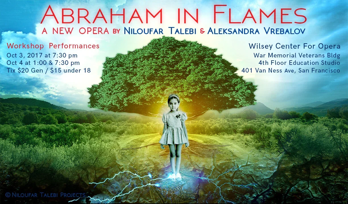 Abraham in Flames, an Opera for Girls Chorus is a new opera by creator/producer Niloufar Talebi, composer Aleksandra Vrebalov, and director/dramaturg Roy Rallo. The opera is inspired by Talebi's coming of age in Tehran around the iconic Iranian poet Ahmad Shamlou who attended her parents' underground literary salons, the staggering imagery in Shamlou's life and poetry, trials by fire, and the Tree of Life.