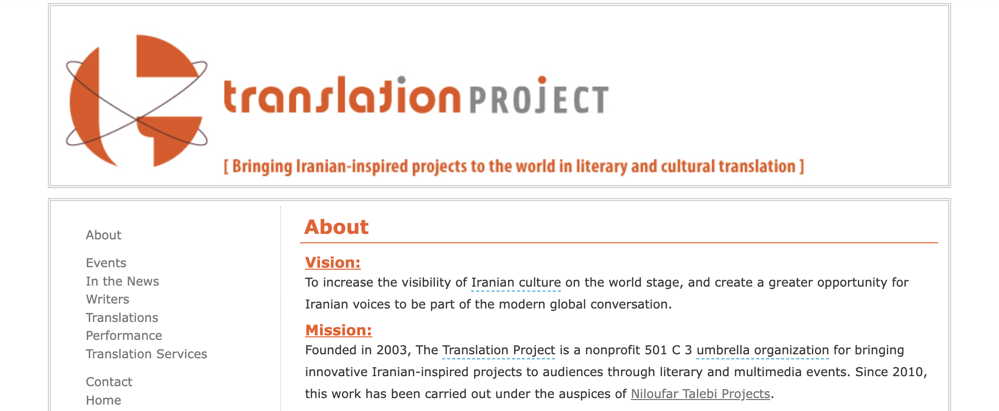 Org Founded in 2006, The Translation Project is a 501 (c) 3 nonprofit organization that brings Iranian-inspired projects to the world in literary and cultural translation.
